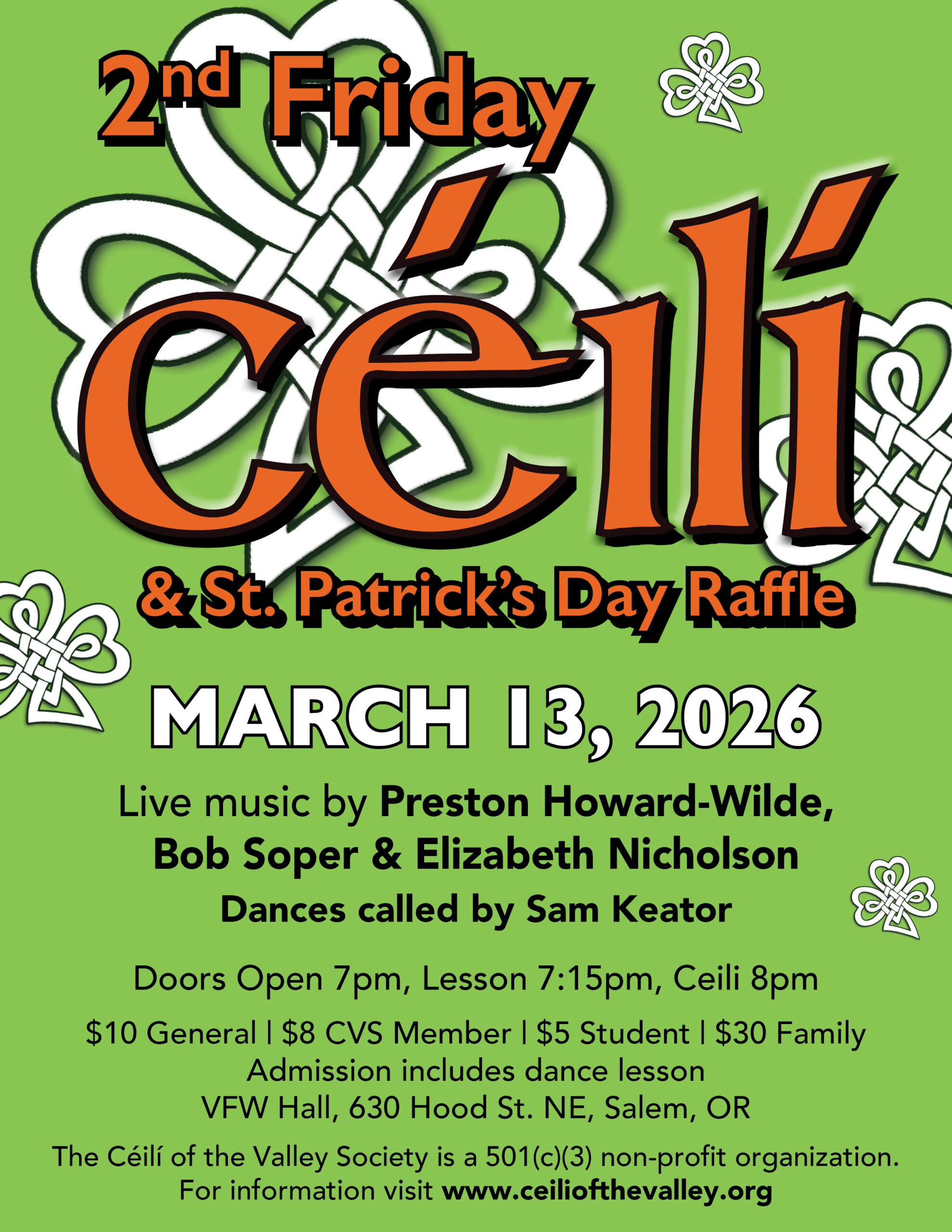 Inclement Weather Watch: CVS will cancel their class or céili if the Salem-Keizer schools and colleges cancel classes for the day or there is an early release. Please watch our website and Facebook for notifications. You may email us your name and contact information (mobile number or email) or sign up at our class if you would like to be notified if there are cancellations.